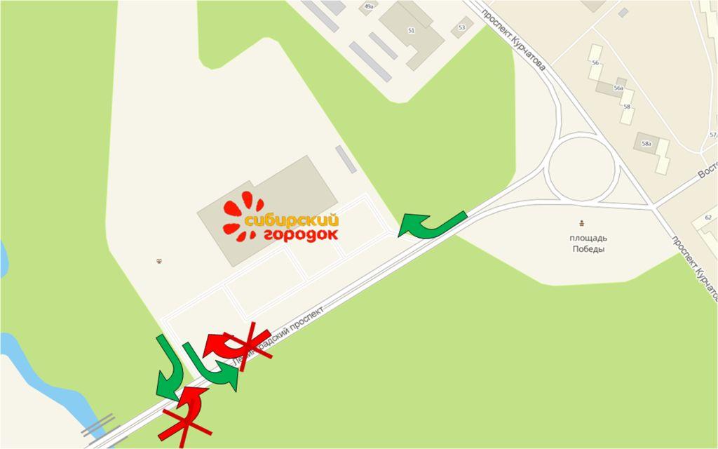 С 30 декабря с целью обеспечения безопасности дорожного движения и повышения пропускной способности автомобильных дорог, изменится схема движения автотранспорта в районе выезда от ТЦ «Сибирский городок» на пр. Ленинградский. Въезд на территорию торгового комплекса по проезду, расположенному в районе р.Кантат, будет закрыт, по нему будет осуществляться только выезд.